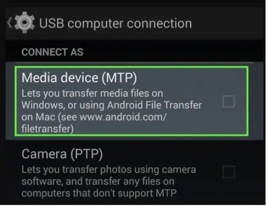 - The transfer protocol is not MTP: If you are trying to copy files from an Android-based device, but an error message comes up because the transfer protocol is not set to MTP, you may try switching this setting. To display the media device connection mode, you must associate your phone with your computer’s USB connection preferences.