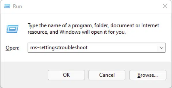 - First of all press the Windows + R buttons together to open the Run box. Type “ms-settings:troubleshoot” and hit Enter to open the Troubleshooting tab of the Settings tab.